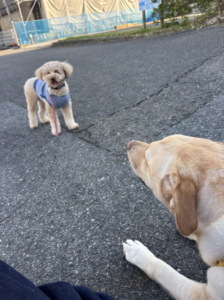今日はまほろスタッフの神崎さんの愛犬と遭遇して固まるココくん。