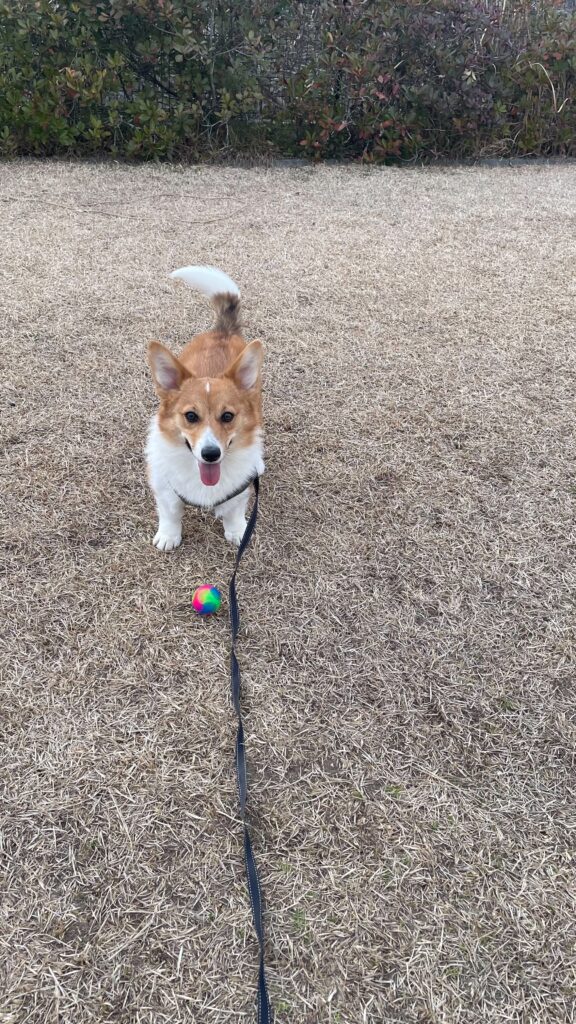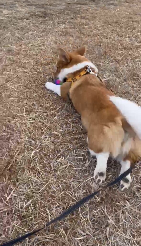 途中、ボールを咥えながら後ろ足がびょーんって