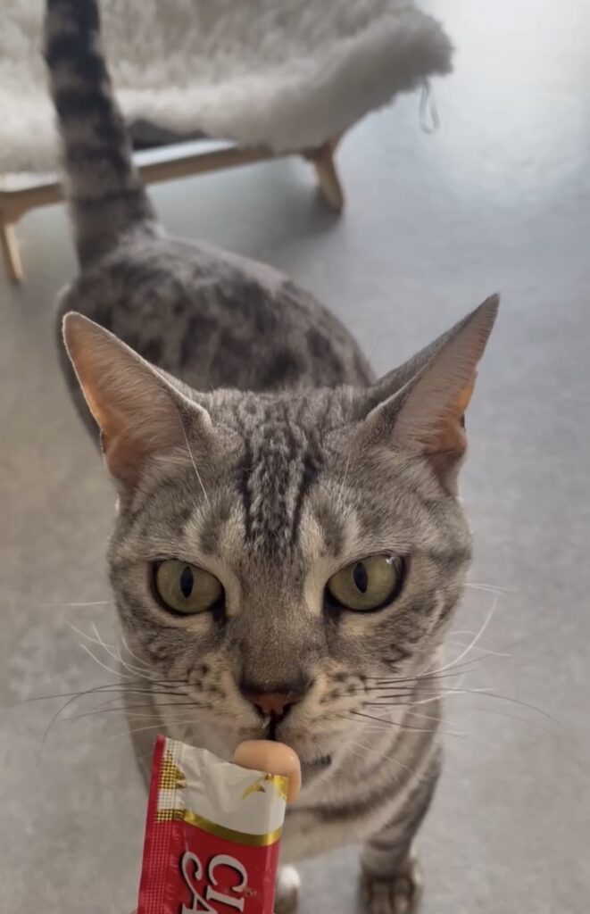 お留守番のご褒美にチュールもぺろり。